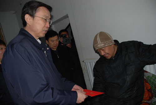 市领导与梁跃河家人亲切交谈、嘘寒问暖,详细询问了梁跃河的家庭生活情况。当得知作为家庭顶梁柱的梁跃河因脑出血多年偏瘫,生活不能自理,爱人下岗,儿子在上高中,老母亲也患有心脏病,生活十分困难时,李书记鼓励他们要树立生活的信心,勇敢面对眼前的困难,相信在党和政府的帮助下,生活困难会逐渐得到解决,日子也会一天天地好起来,并嘱咐在场的随行人员,要采取措施,尽力帮助他们,让他们过一个欢乐、祥和的春节。当接过饱含全市人民关怀与温暖的慰问金时,因病不能说话的梁跃河流下了感动的泪水,其老母亲激动的说:感谢党和政府,感谢市领导、工会领导冒着严寒来看我们!